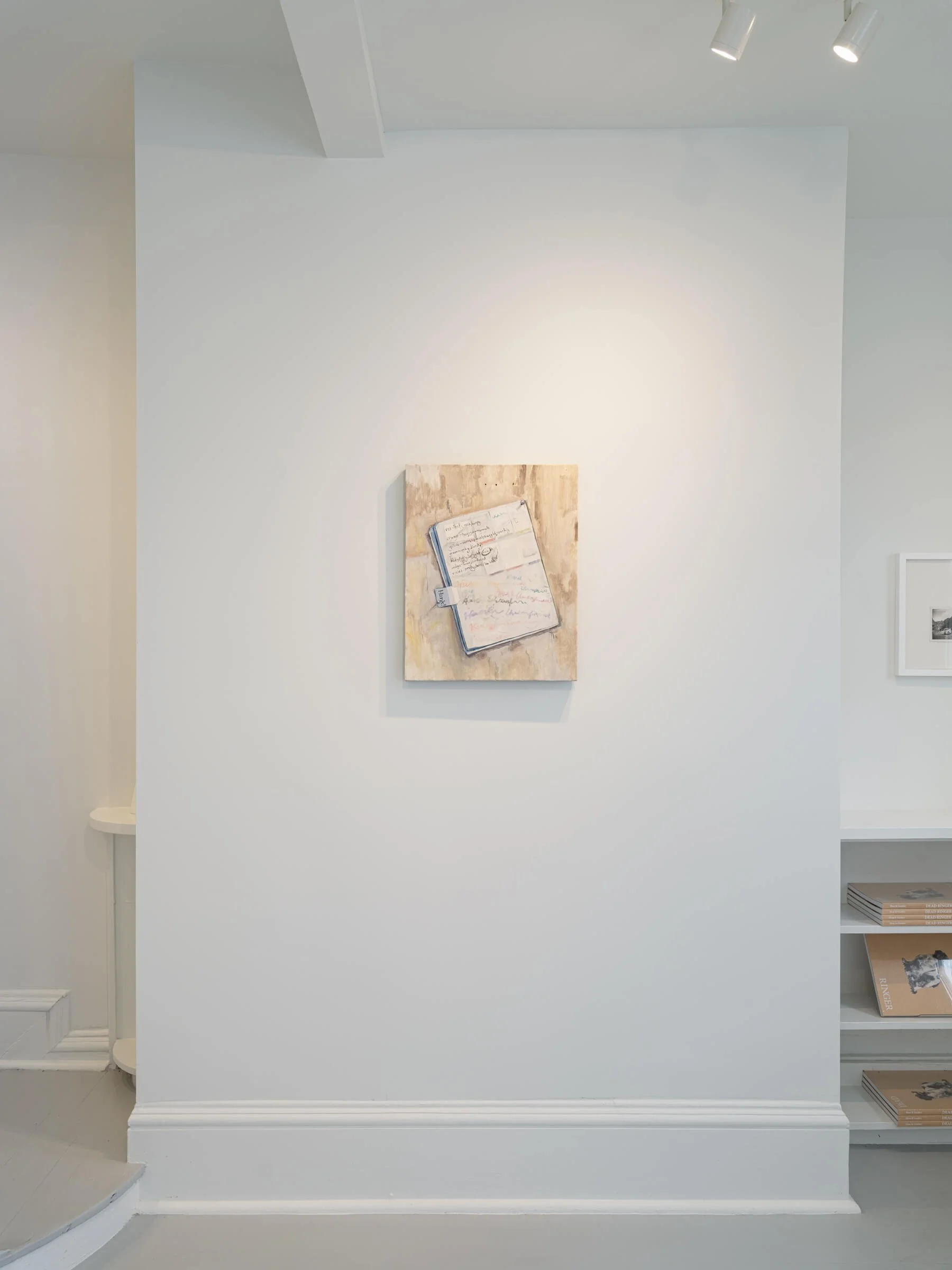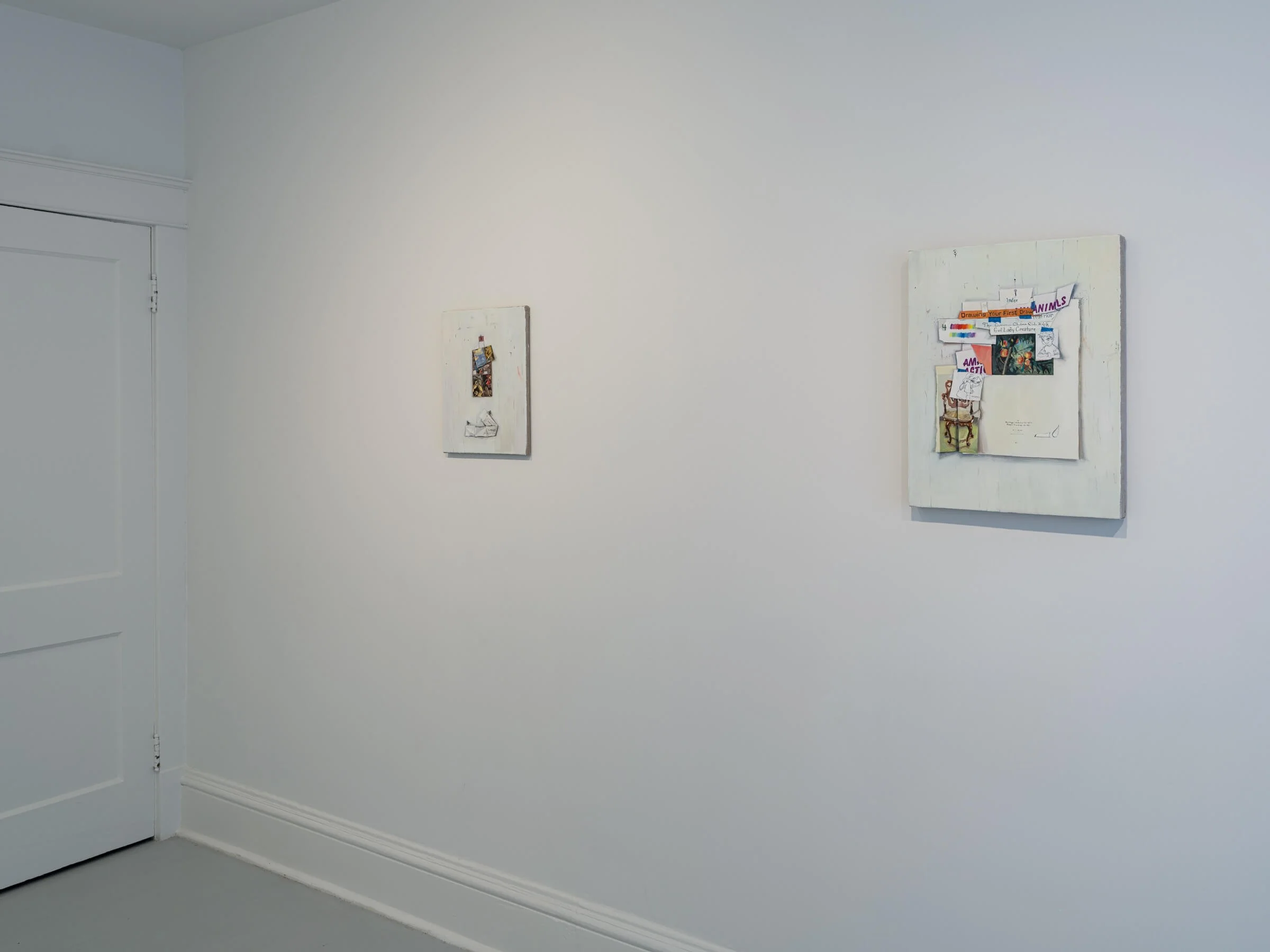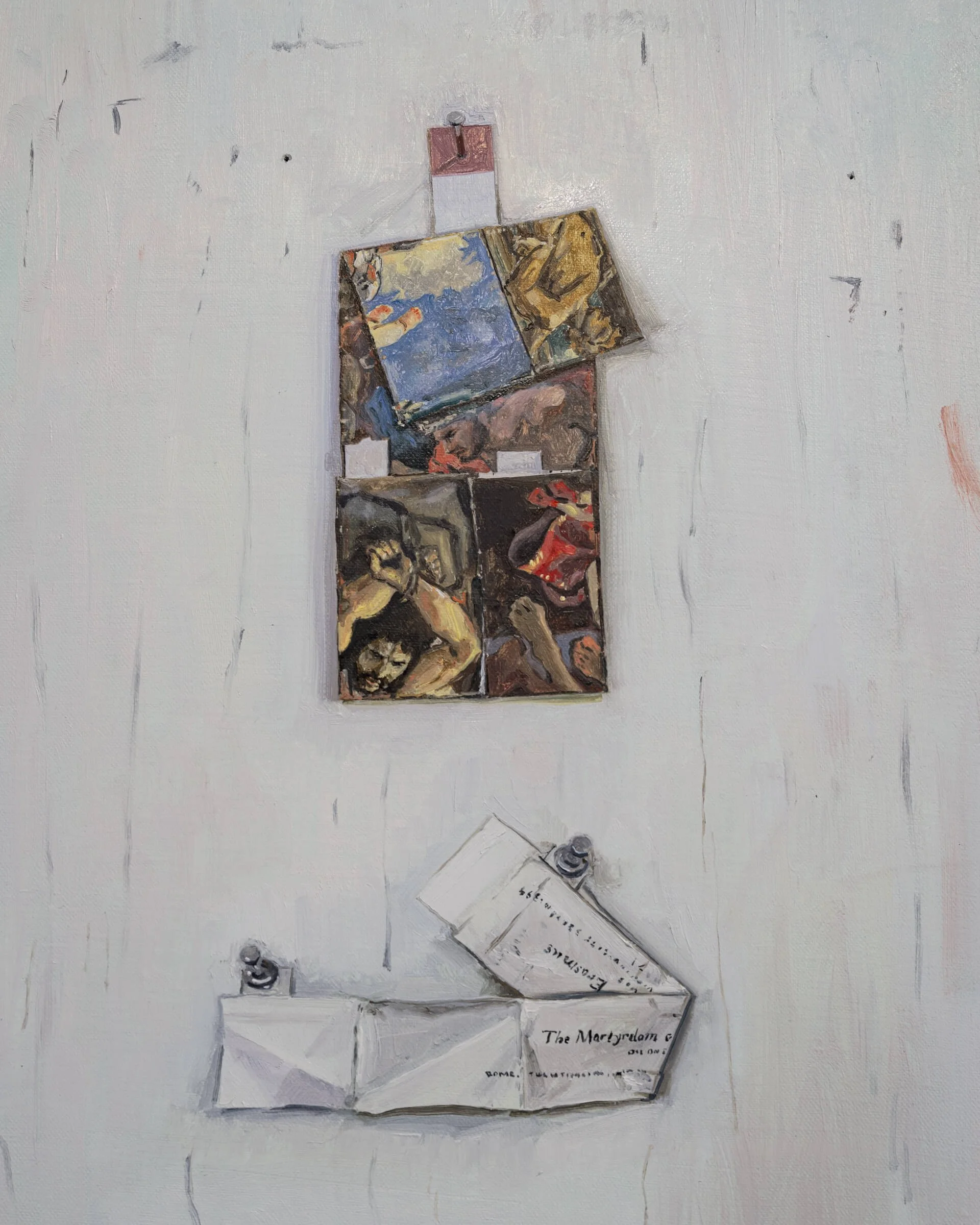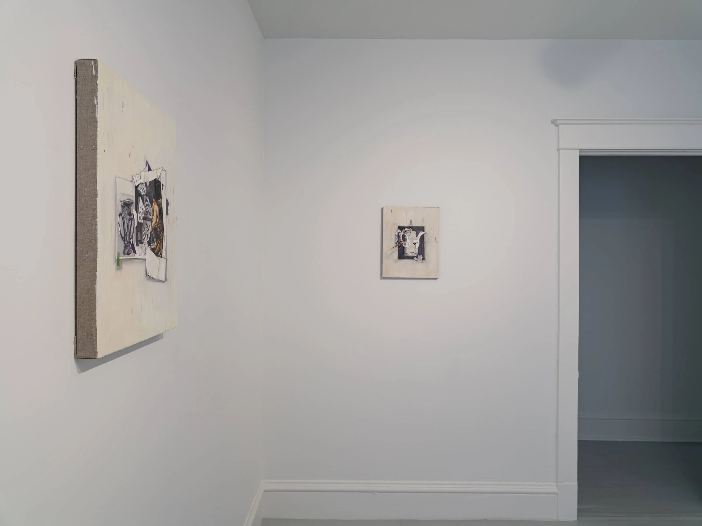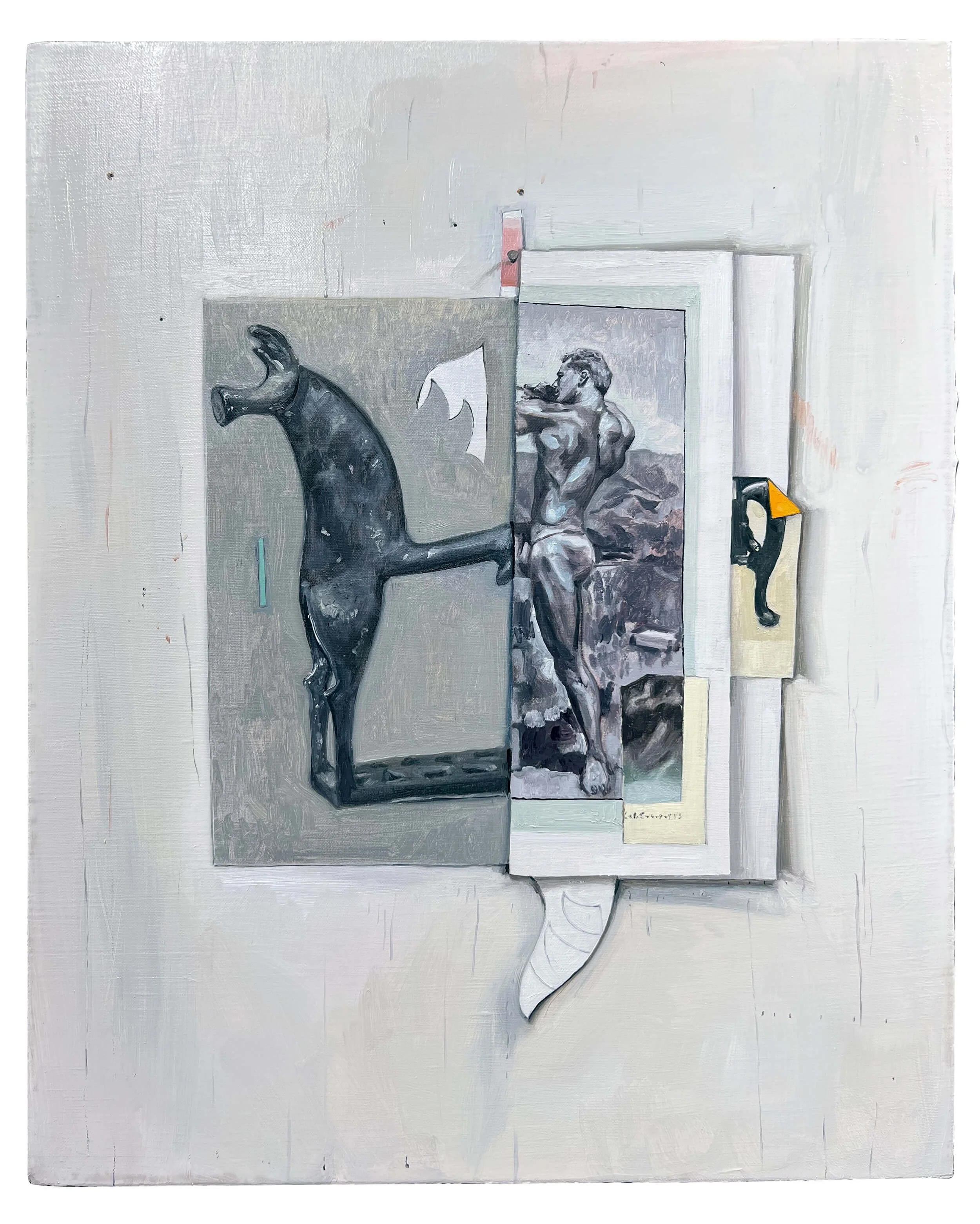 “My process begins with the assemblage of collages made from old auction catalogs, gay erotica, instructional guides, museum catalogs, and other assorted imagery. Materials are cut, folded and stuck back together repeatedly to make haphazard compositions that force histories and images together unexpectedly. These collages are then affixed to the walls of his studio and painted from life as trompe l’oeil. My approach is not photorealistic. Imagery goes in and out of focus. My loyalty is not to exactly how it was but to the affective and the procedure of observation. The paintings themselves do not confess to ownership of this imagery and their origins, only the plain observation of their time stuck to the studio wall.