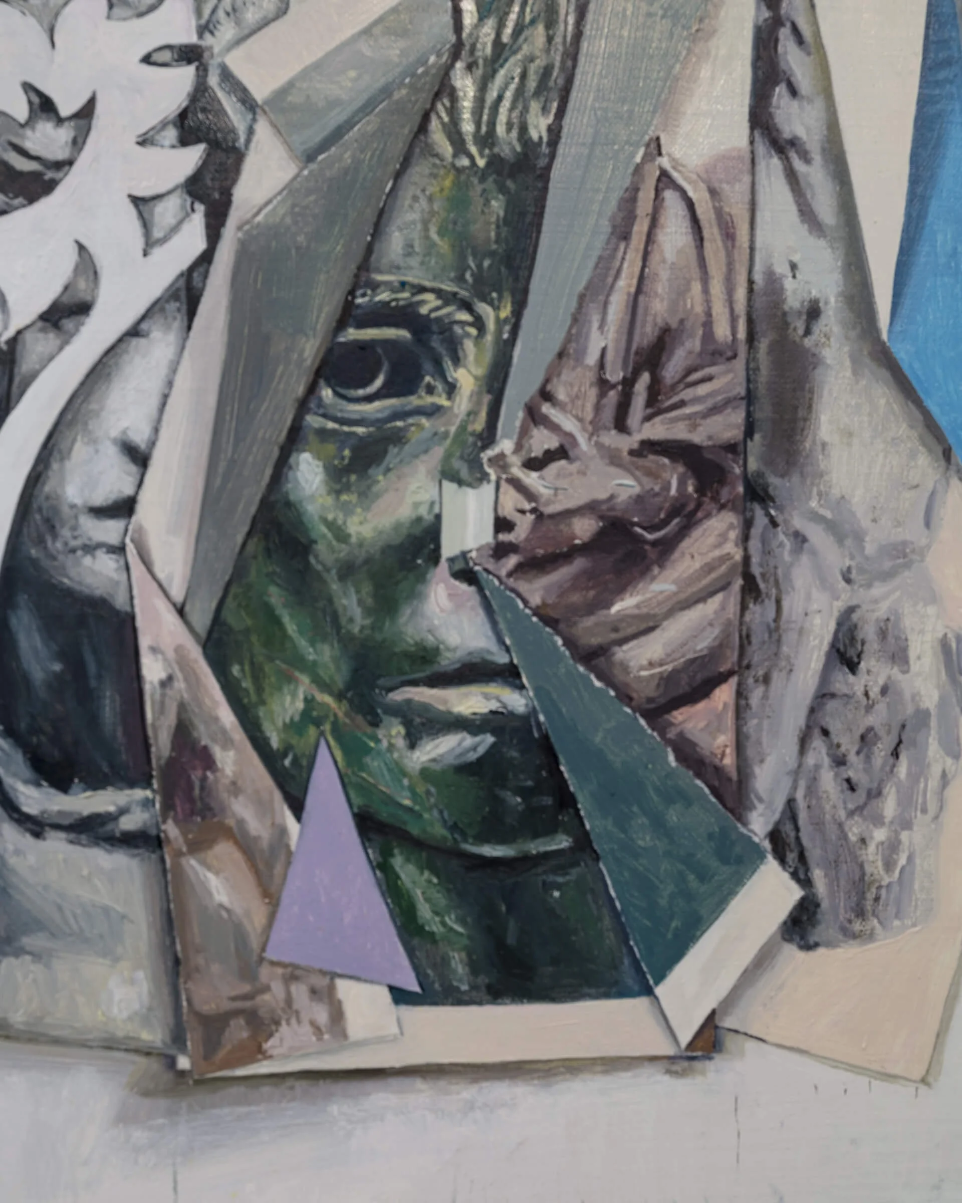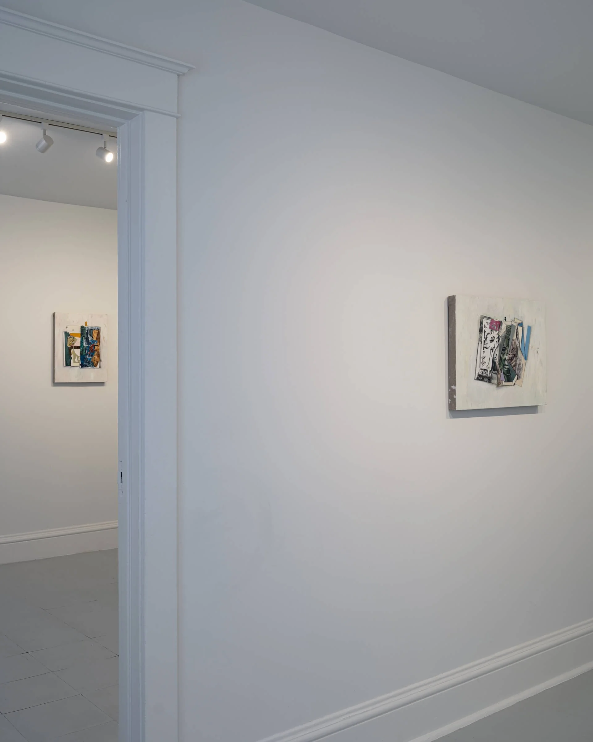 This process of presentation and concealing is a critical component of how the erotic operates for me, and is an important means for me to point at queerness while holding it at a distance. The paradox of pictorial excess and the inevitable violence as loss through an archival act is central to my process. Folds in the collage pull information out of view, simultaneously present and erased in the translation from paper to paint. Pin and screw holes in the studio wall rupture the actual studio wall and the seemingly flat surface of the painting. Decay through time is inevitable but what remains points one hand towards history and another towards the predictable and unknowable nature of what follows. Despite the random and abject the violence of our times, something does come next.”