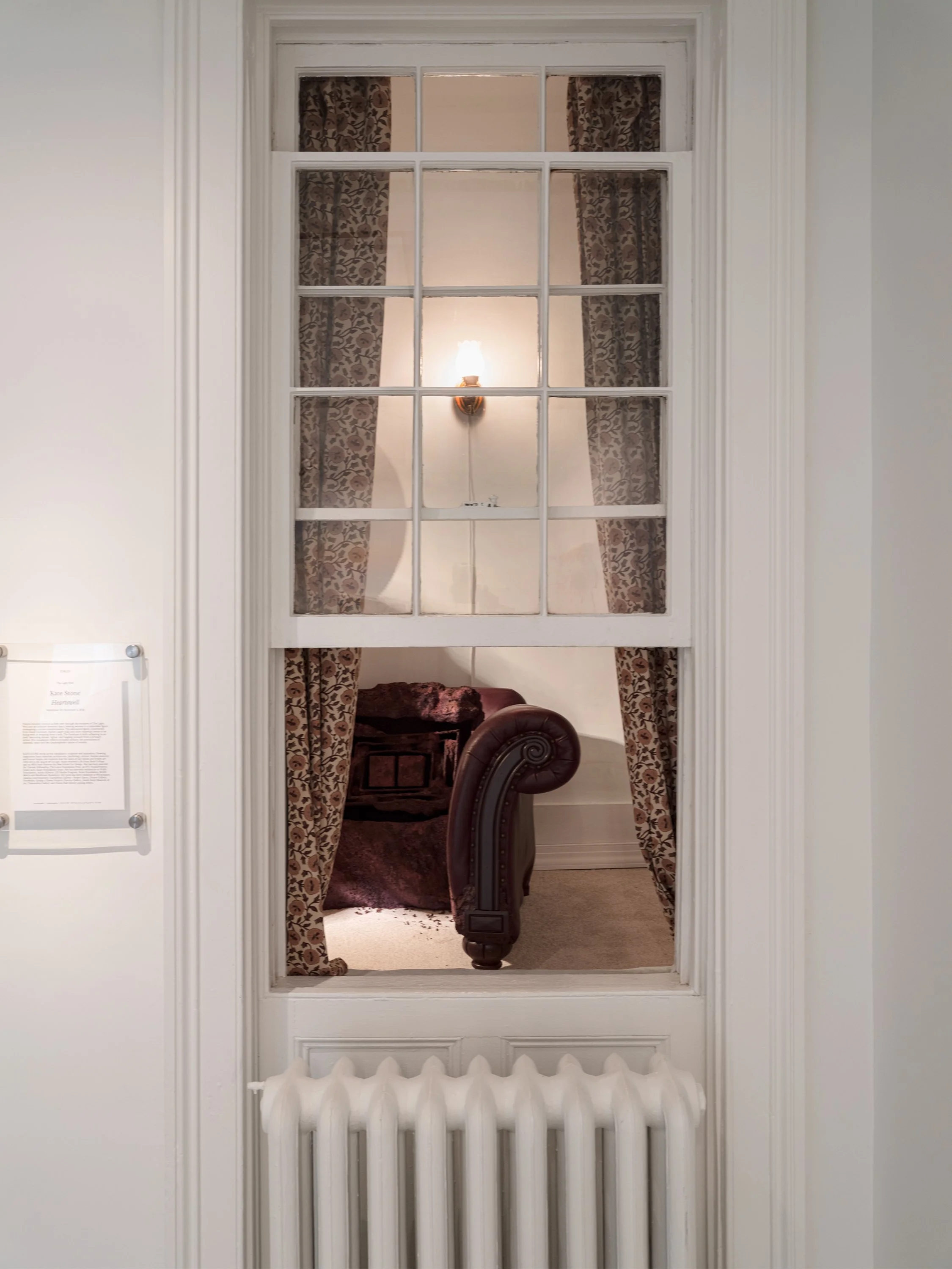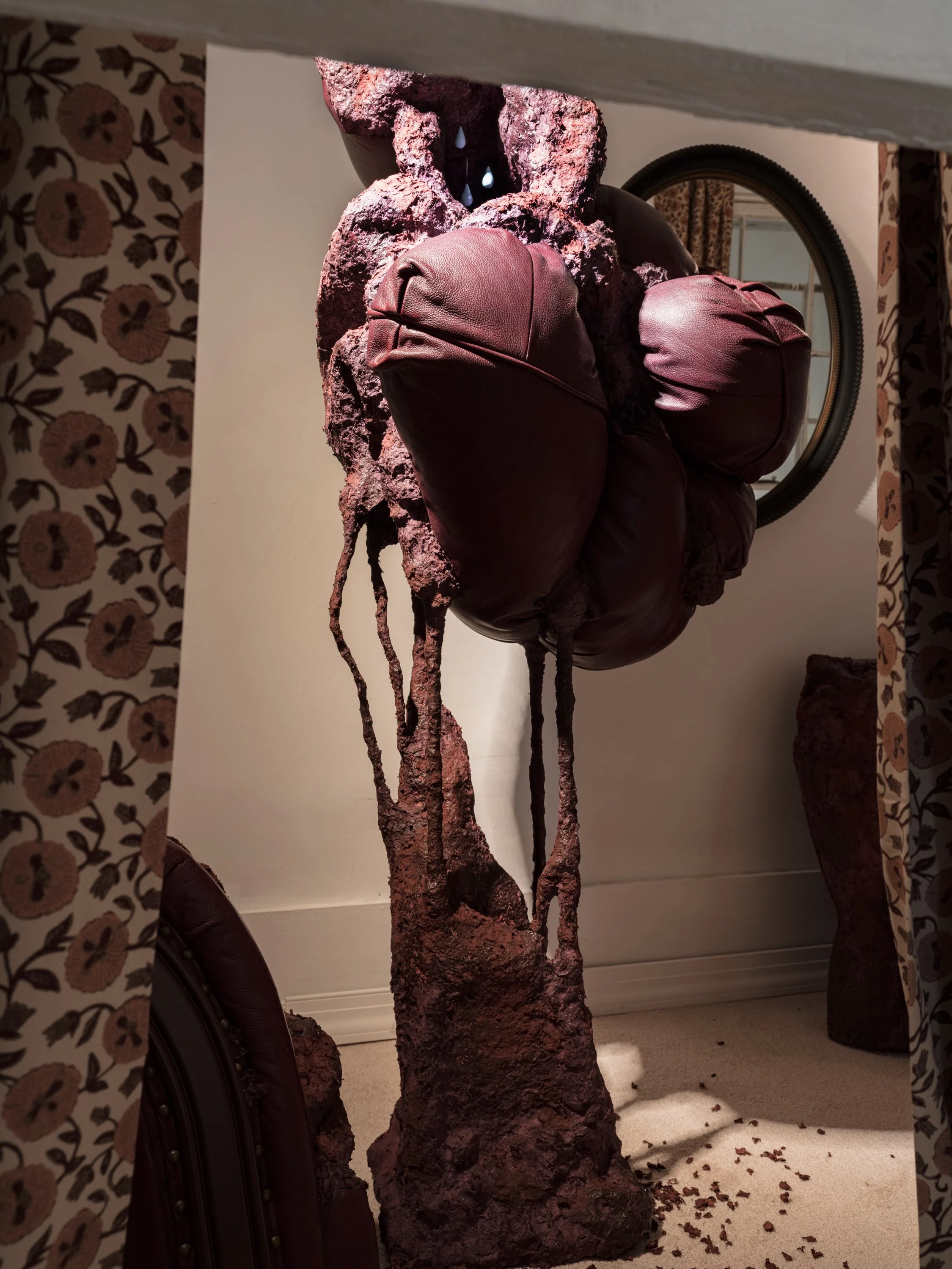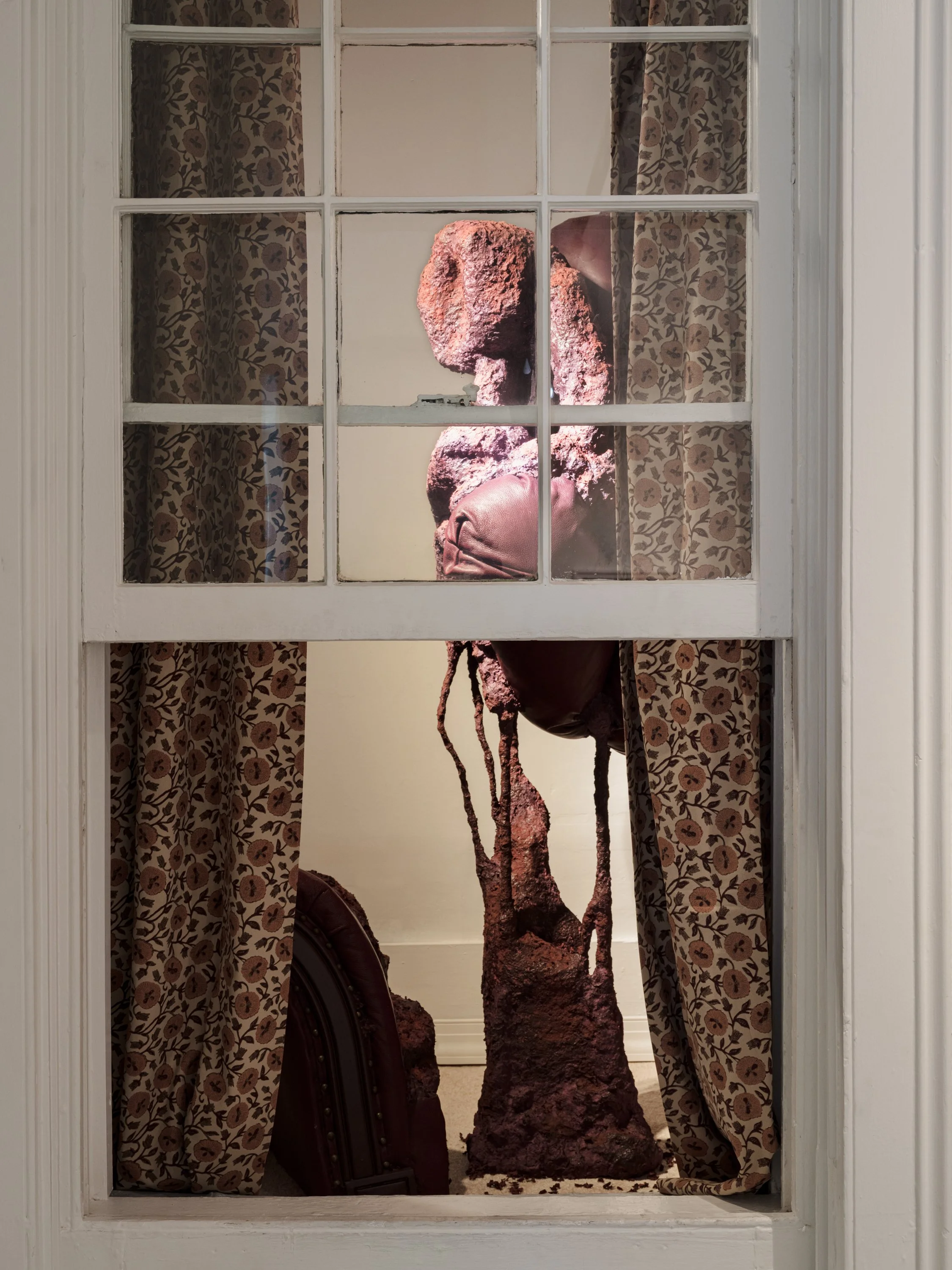 Visitors become voyeurs as they peer through the windows of The Light Well into an intimate domestic space, bearing witness to a vulnerable figure undergoing a private transformation. The abstracted figure, constructed from found furniture, leather, paper pulp and other materials seems to be fusing with or erupting from a sofa. The furniture is both collapsing in on itself, becoming denser, tighter, and bulging outward from a pressure within. The installation reflects on bodily privacy, the porousness of domestic space and the claustrophobic nature of anxiety.