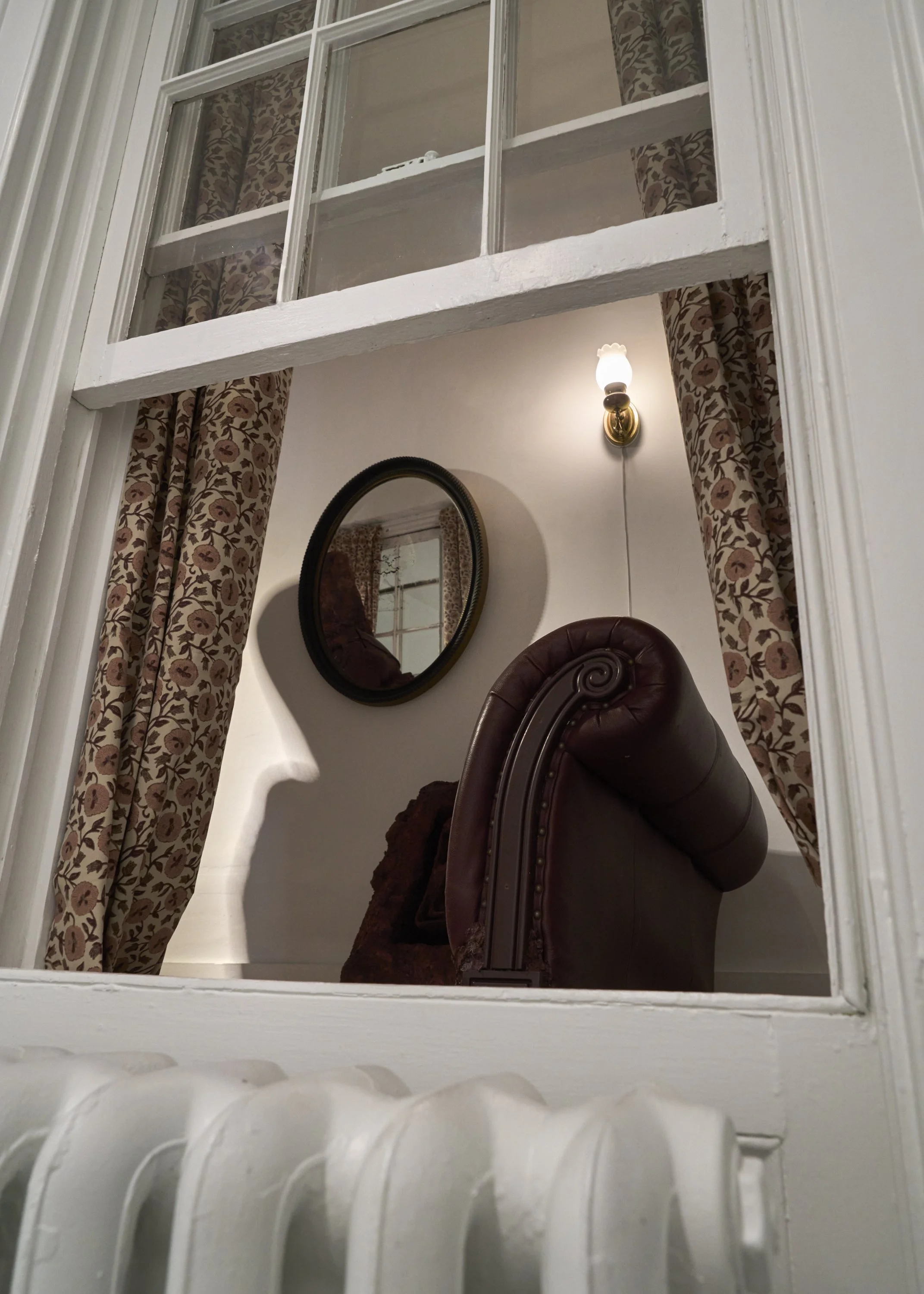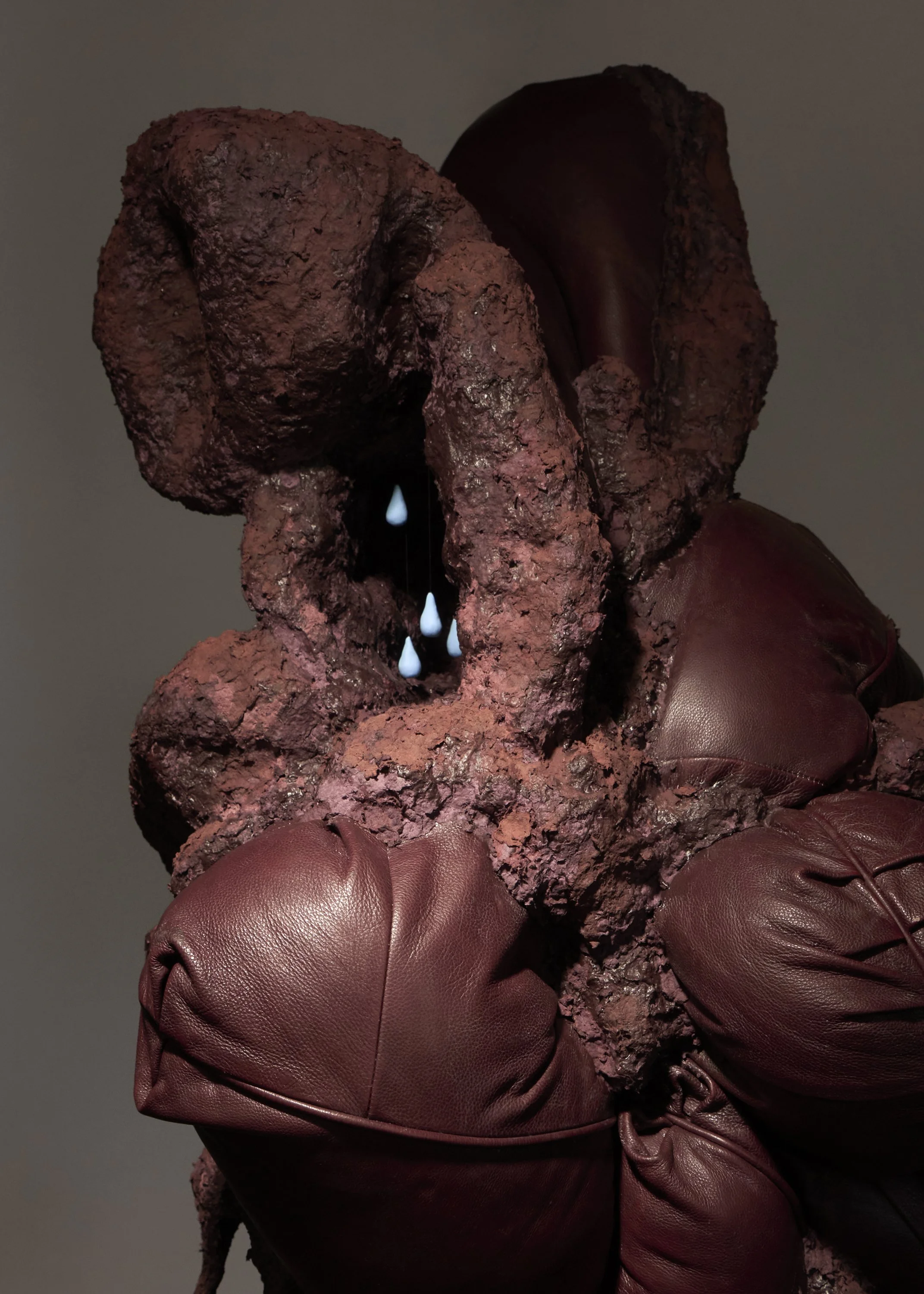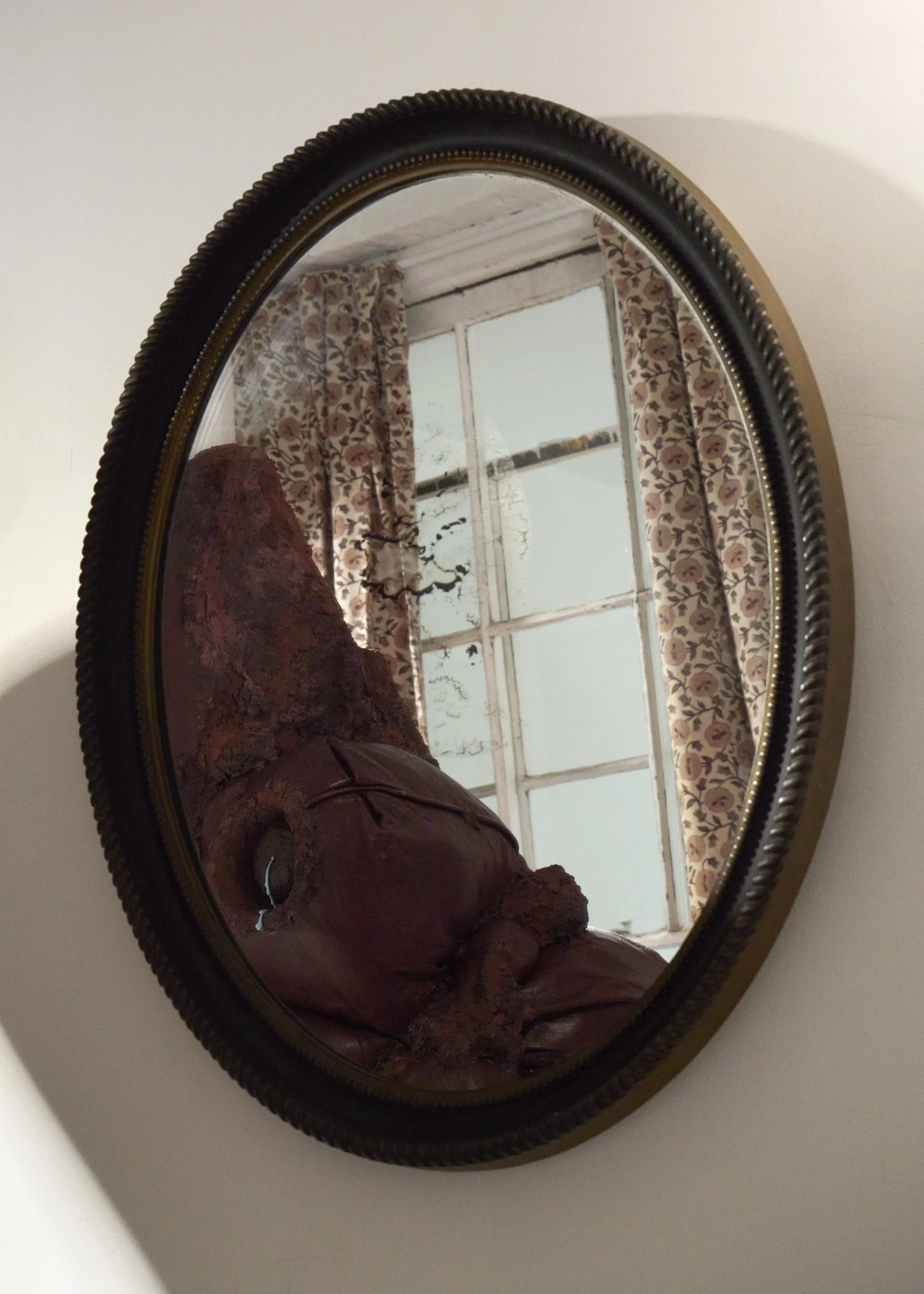 Visitors become voyeurs as they peer through the windows of The Light Well into an intimate domestic space, bearing witness to a vulnerable figure undergoing a private transformation. The abstracted figure, constructed from found furniture, leather, paper pulp and other materials seems to be fusing with or erupting from a sofa. The furniture is both collapsing in on itself, becoming denser, tighter, and bulging outward from a pressure within. The installation reflects on bodily privacy, the porousness of domestic space and the claustrophobic nature of anxiety.