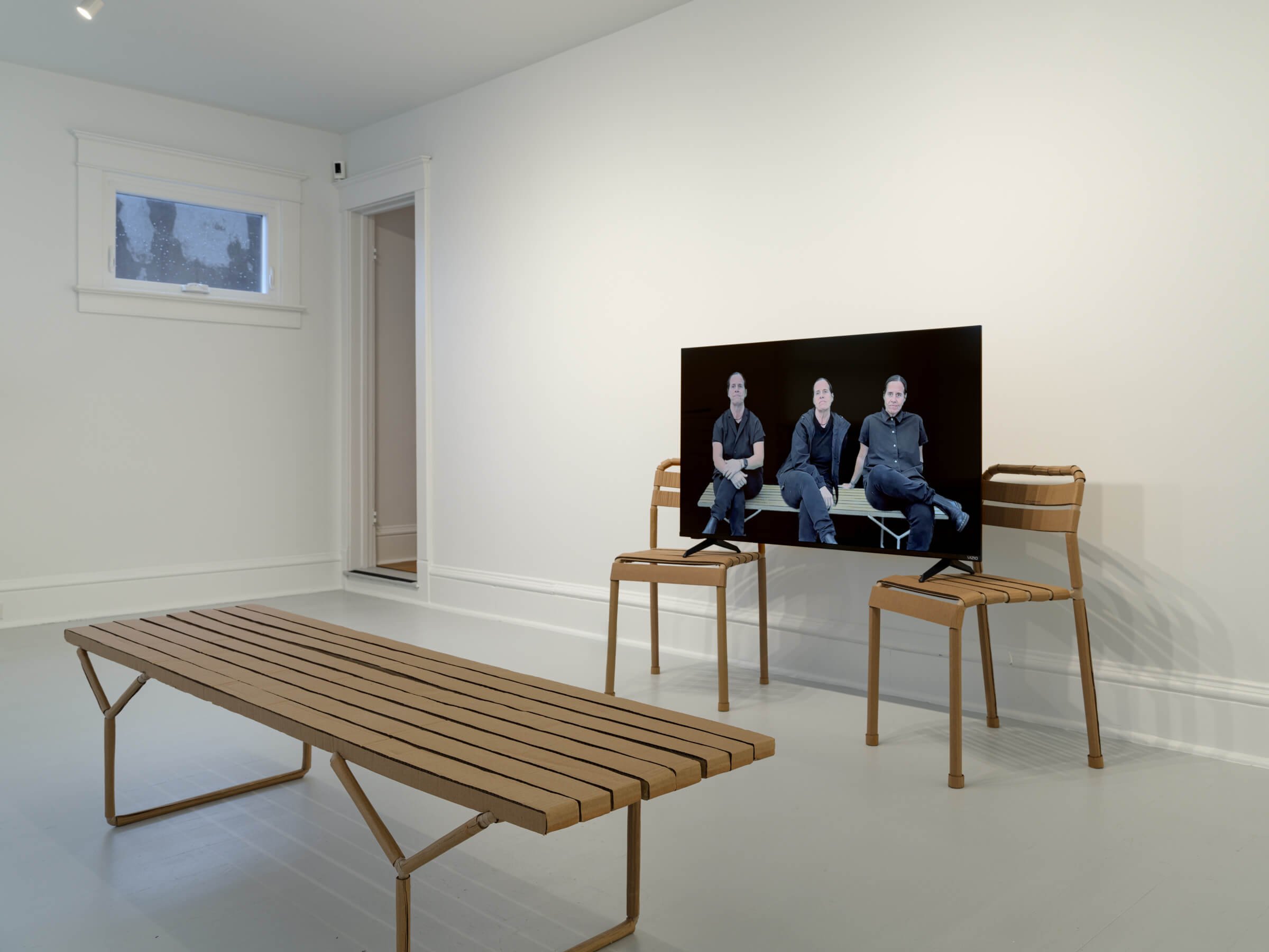 Kristen Mills, Audience for an Audience 01, 2024, video still, cardboard bench, 1080 x 1920 inches